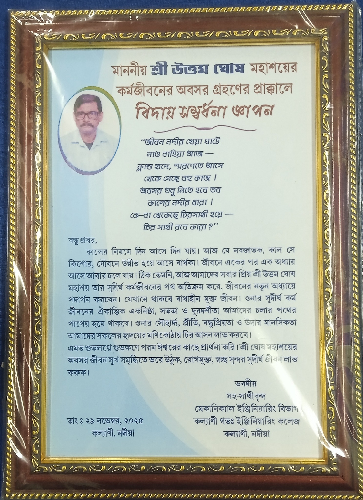 On November 29, 2025, a farewell ceremony was held in the CAD Lab of the Mechanical Engineering Department of Kalyani Government Engineering College in honor of our colleague Shri Uttam Ghosh's superannuation from his current position. Emotions, laughs, and lovely memories abounded during the program. Attached are a few views of this program. During this occasion, every employee of KGEC's Mechanical Engineering Department wished Shri Uttam Ghosh health and success as well as the best for the next phase of his life.