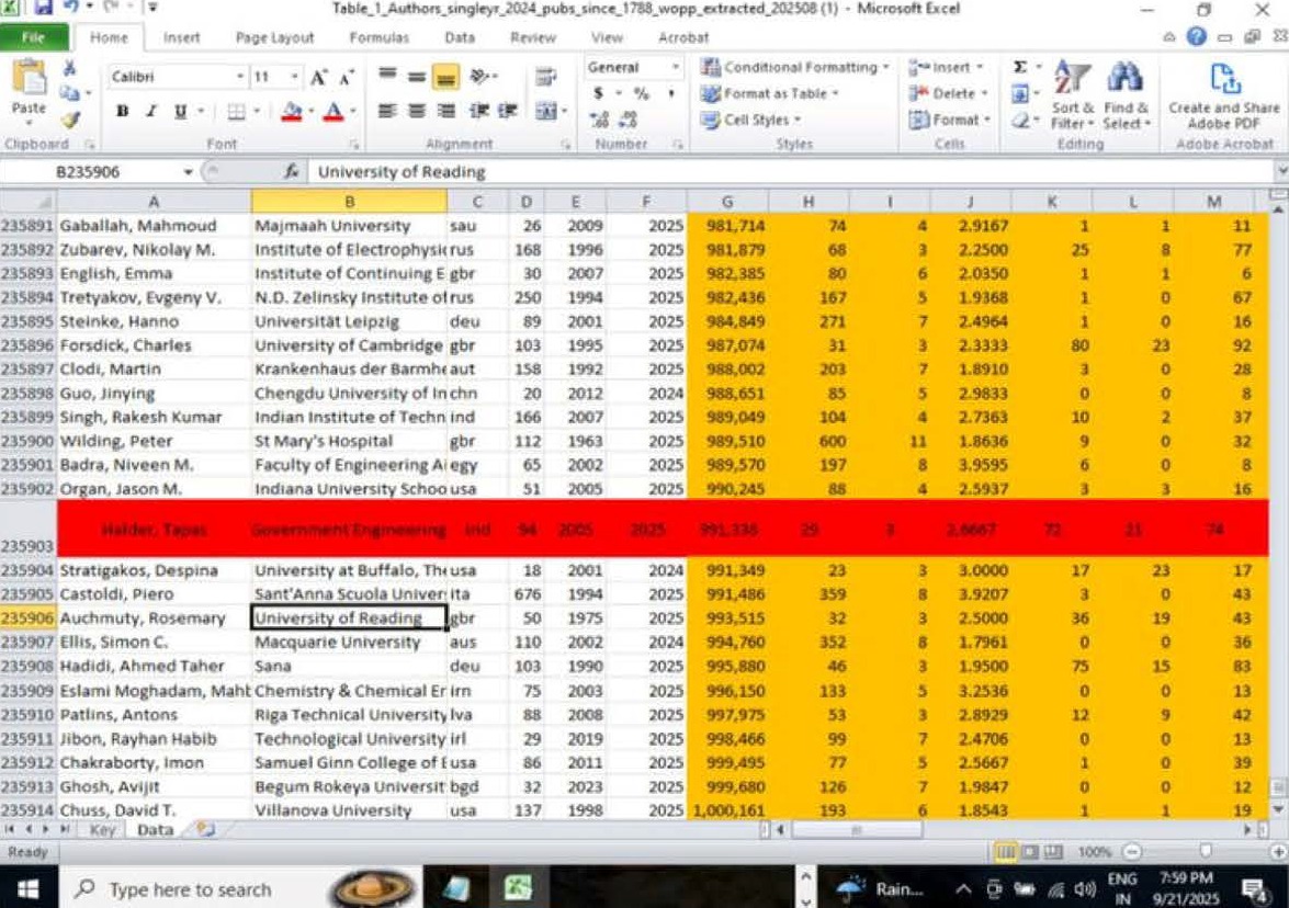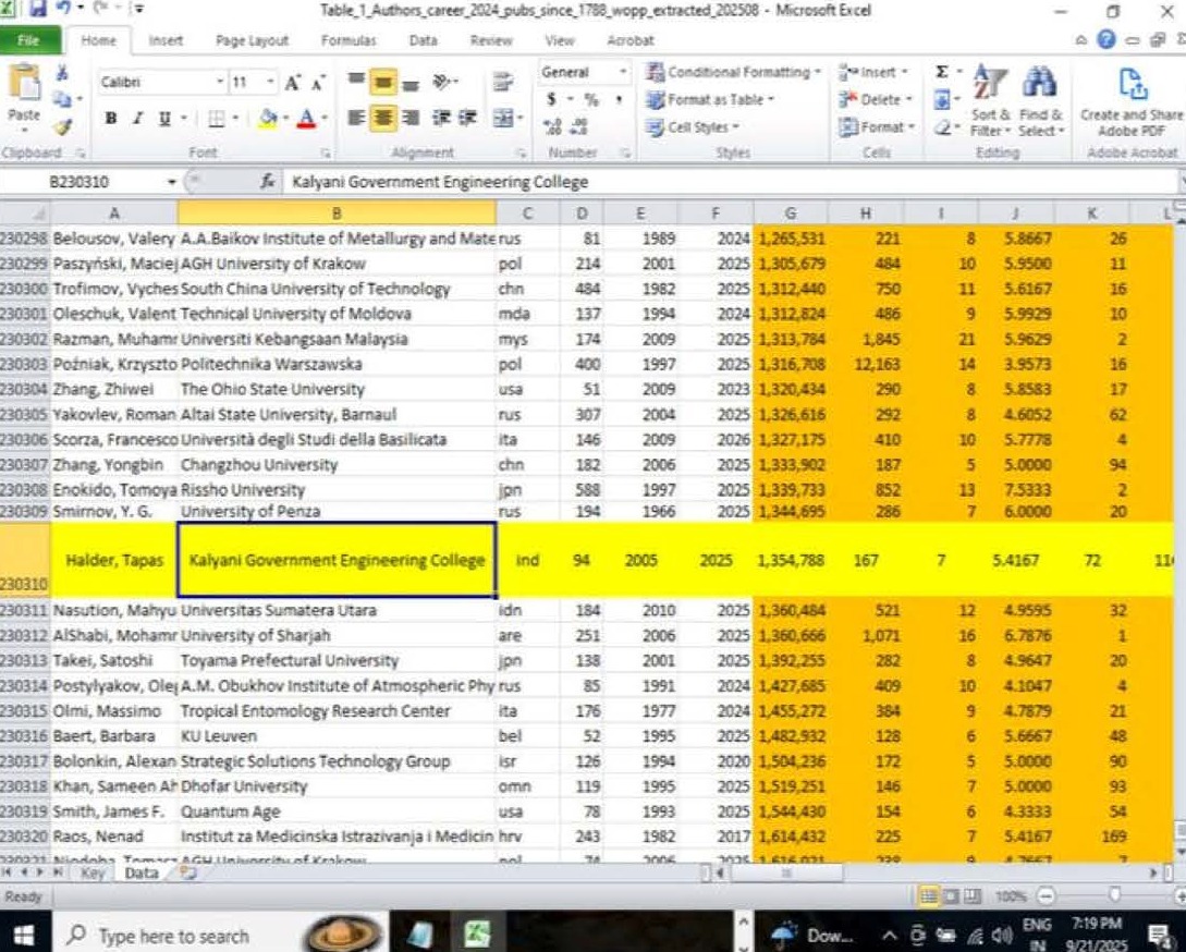 Stanford University has recently published an update of the list of the top 2% most widely cited scientists in various disciplines, which is considered to be the most prestigious ranking in the world. Dr.Tapas Halder. The selection is based on the top 100,000 scientists by score (with and without self-citations) or a percentile rank of 2% or above in the sub-field . This version 8 is based on the 19 September, 2025 snapshot from