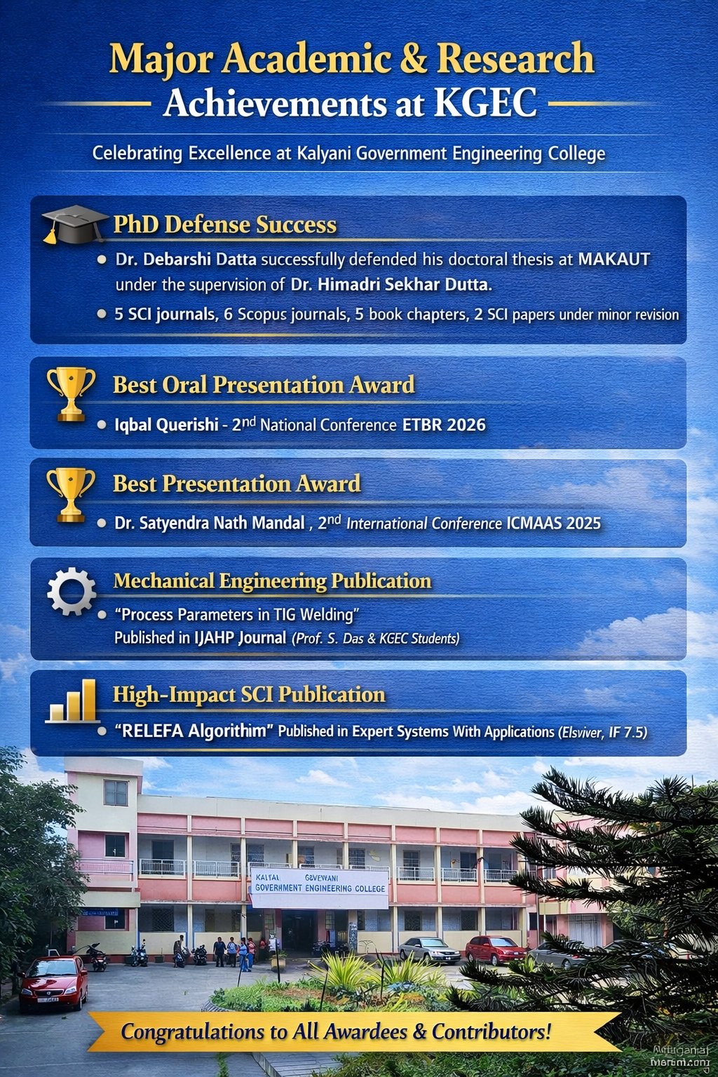 Kalyani Government Engineering College proudly celebrates a series of remarkable academic and research accomplishments by its scholars, faculty members, and students.