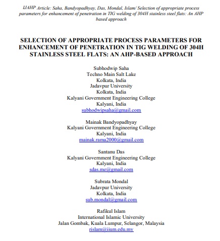 A paper titled “Selection of Appropriate Process Parameters for Enhancement of Penetration in TIG Welding of 304H Stainless Steel Flats: An AHP-Based Approach” has been published in the IJAHP Journal, authored by KGEC students under the supervision of Prof. S. Das (ME Department).